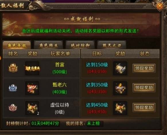 合區后成就福利活動關閉,活動排名獎勵以郵件的形式發送!